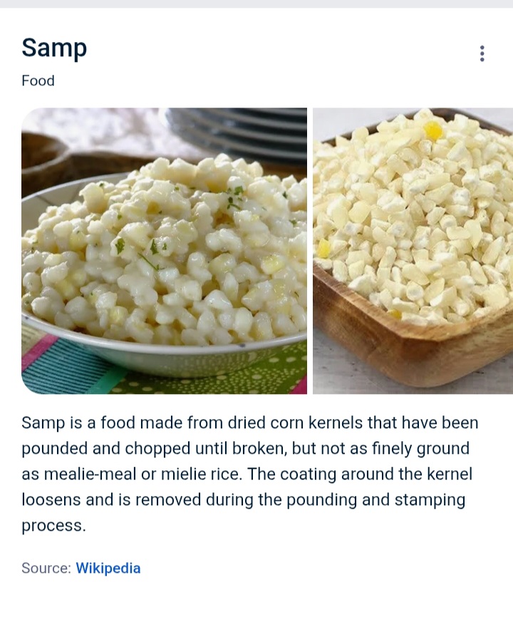 Samp is a South African dish made from dried maize kernels that have been stamped and chopped until broken, but not as finely ground as mealie-meal. It's a staple food in Southern Africa, often enjoyed as a side dish or a main meal, and is known for its hearty and comforting nature.